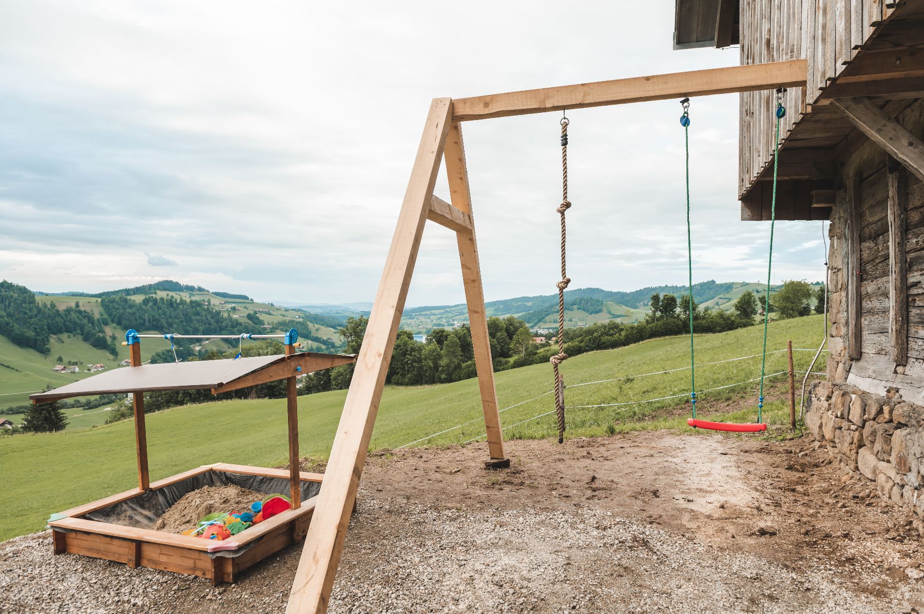 Der Sandkasten und die Schaukel lassen Kinderaugen strahlen. Die Mutterkühe, Weideschweine und Legehennen freuen sich auf Besuch. Je nach Möglichkeit darfst du mithelfen die Kühe auf eine neue Wiese zu bringen, die Schweine und Hühner zu füttern, die Eier zu entnehmen.